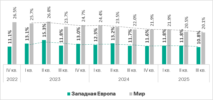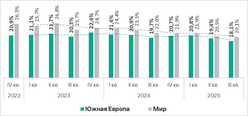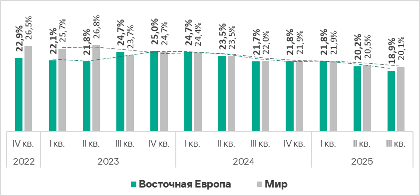 В третьем квартале 2025 года показатель в регионе уменьшился до 18,9% — это наименьшее значение за три года. Оно немного ниже среднемирового и в 2,1 раза больше, чем в Северной Европе, где значение – наименьшее среди регионов.