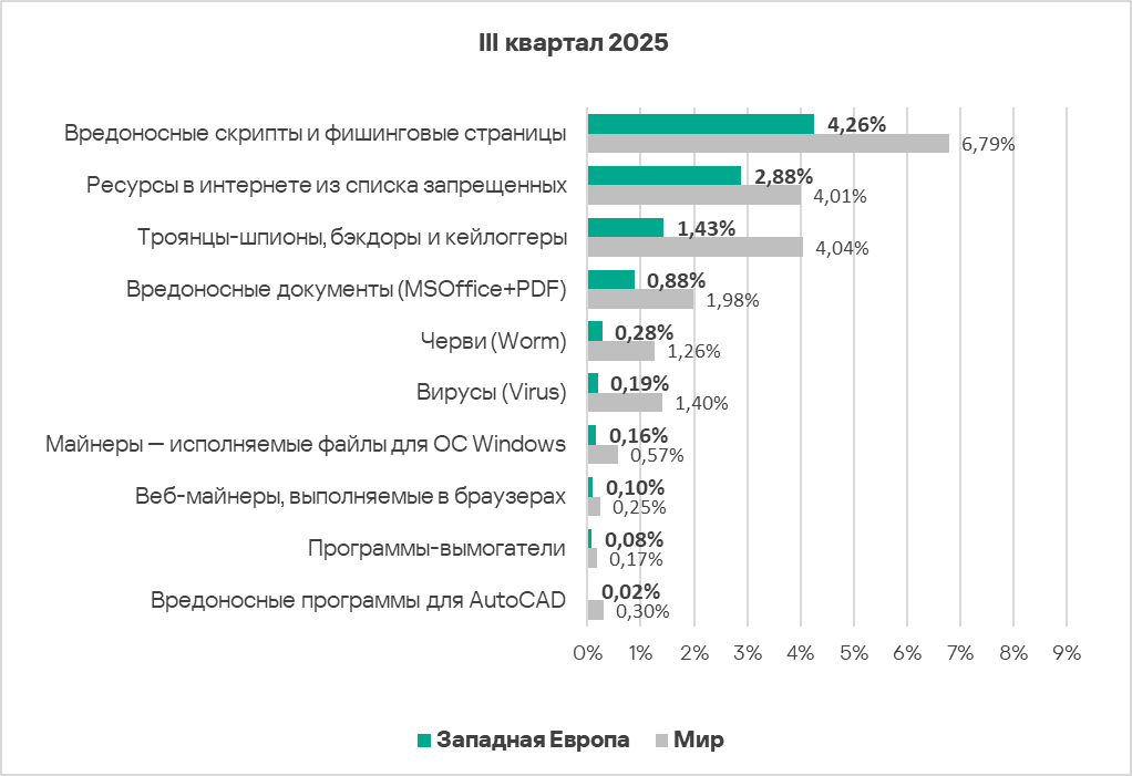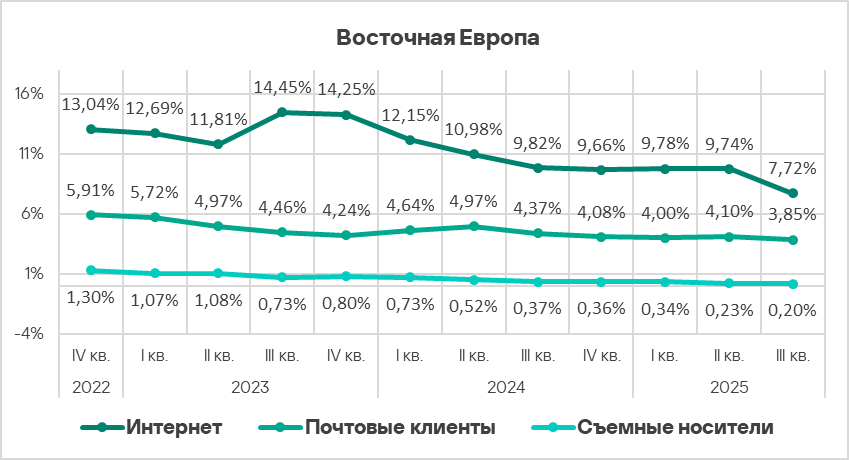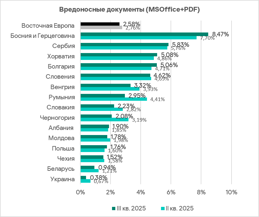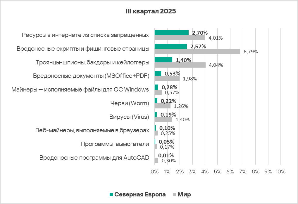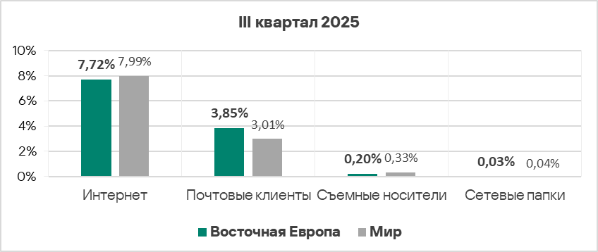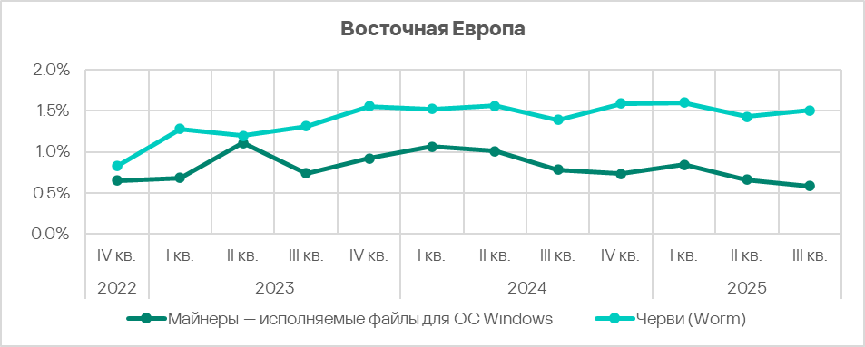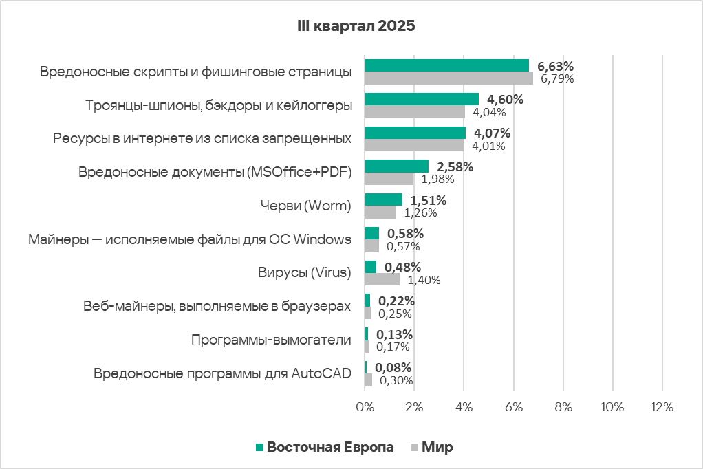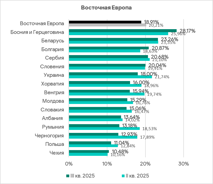 В третьем квартале 2025 года Восточная Европа заняла восьмое место в рейтинге регионов по доле компьютеров АСУ, на которых были заблокированы вредоносные объекты. Показатель Восточной Европы больше, чем в остальных европейских регионах.