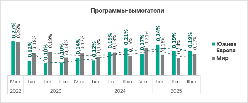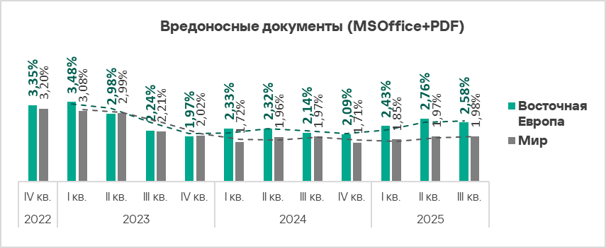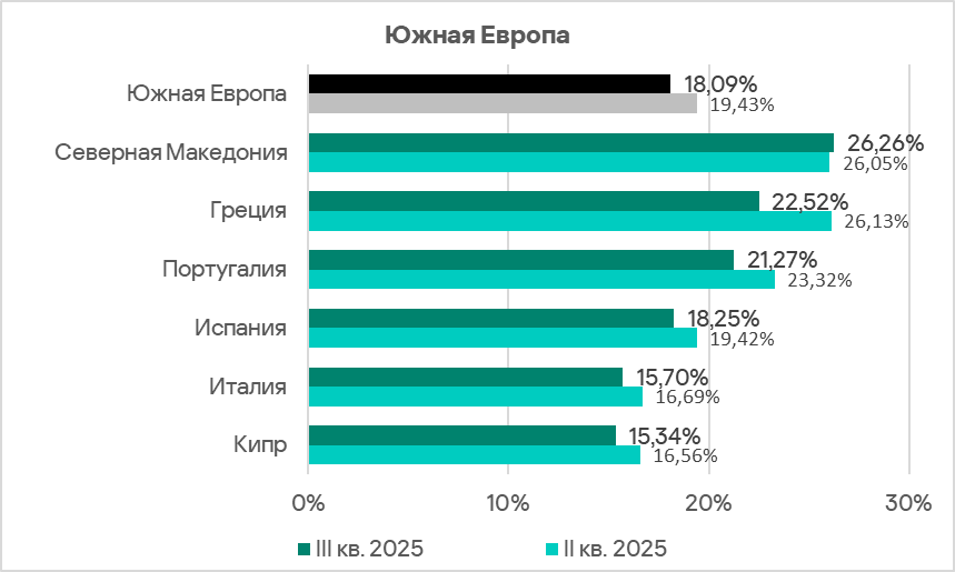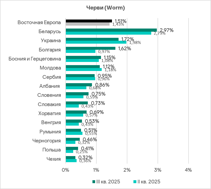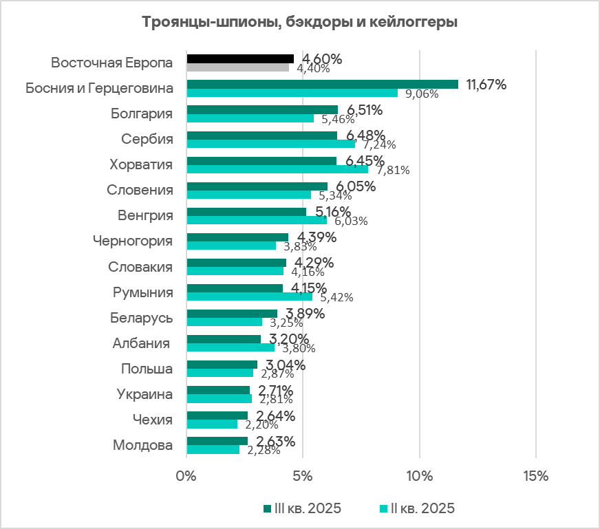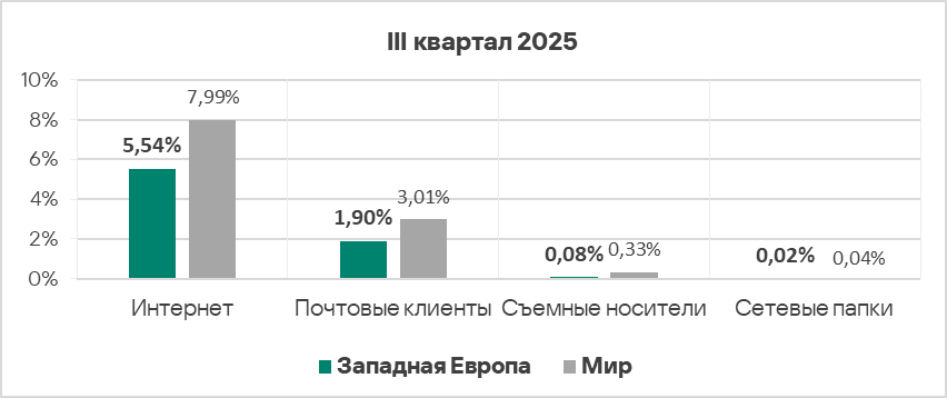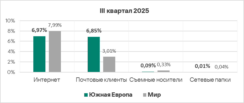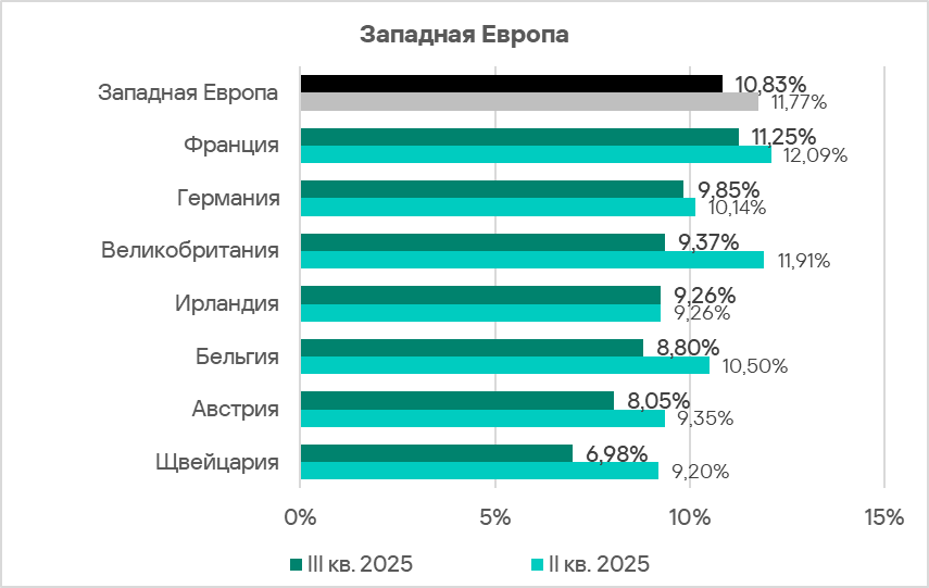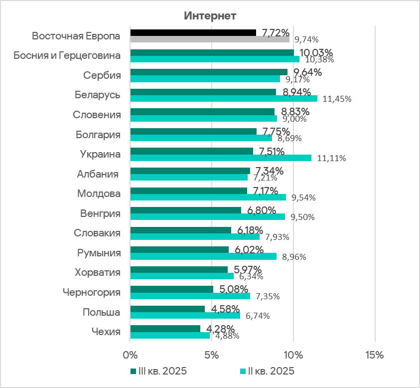 В третьем квартале 2025 года Восточная Европа заняла восьмое место в рейтинге регионов по доле компьютеров АСУ, на которых были заблокированы вредоносные объекты. Показатель Восточной Европы больше, чем в остальных европейских регионах.