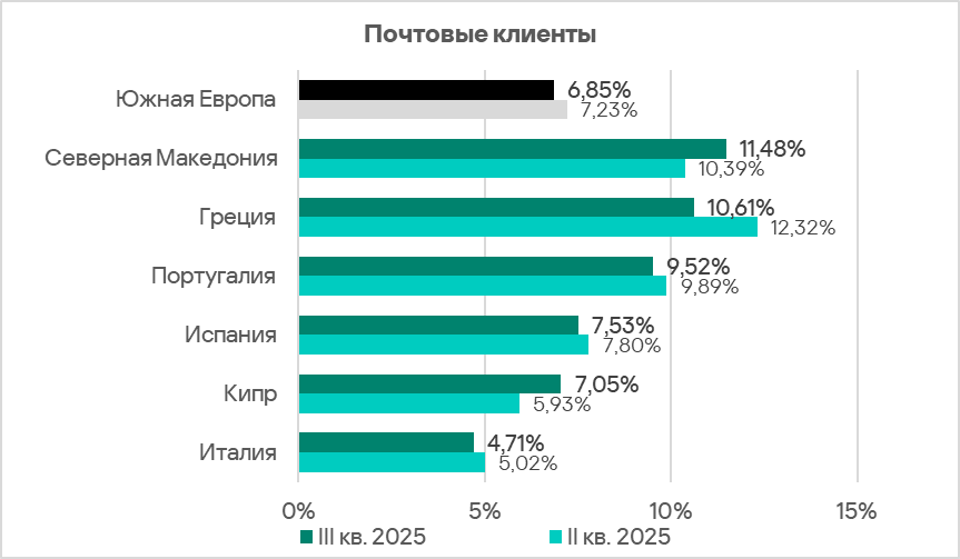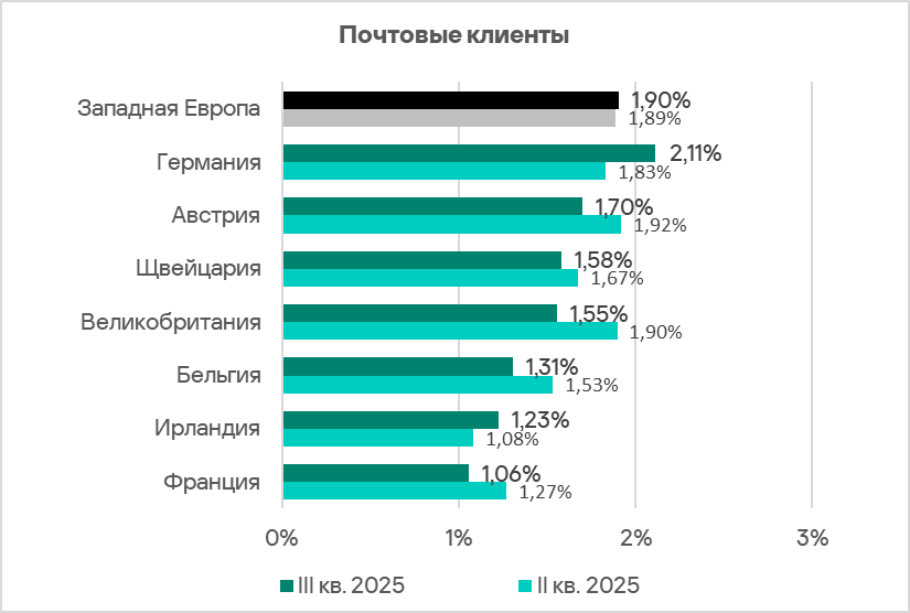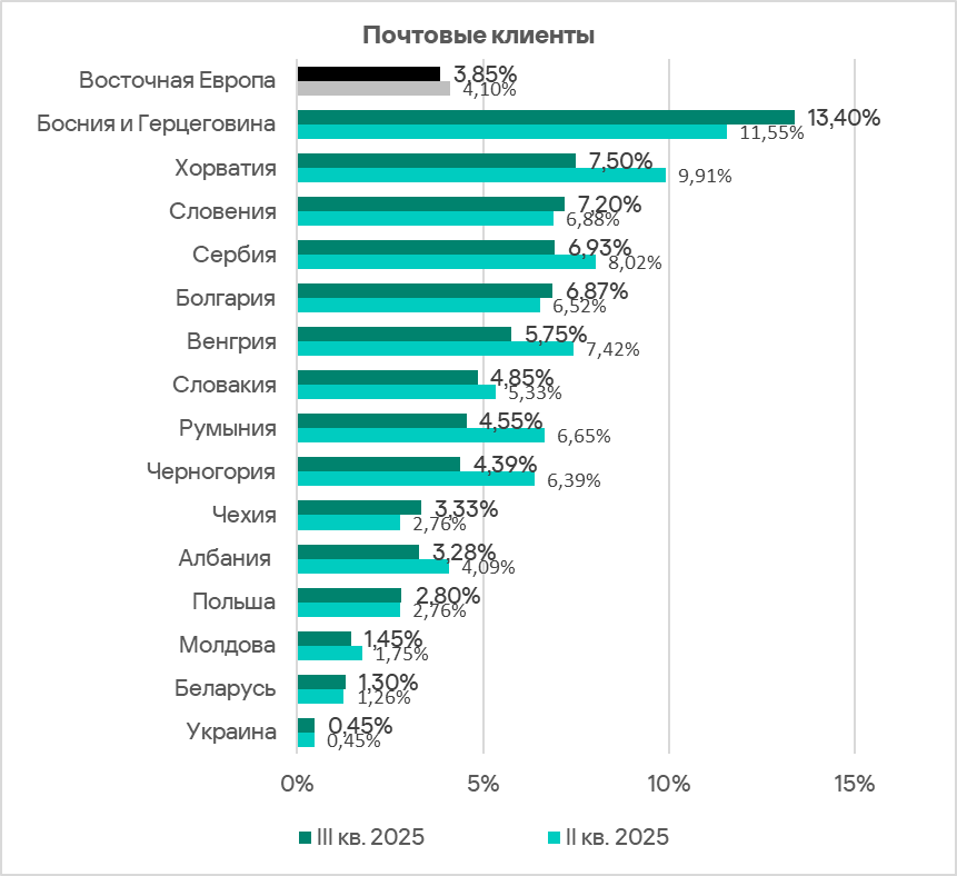 Среди стран региона по доле компьютеров АСУ, на которых были заблокированы угрозы из почтовых клиентов, с отрывом от остальных стран лидирует Босния и Герцеговина с 13,40%. Наименьший показатель – в Украине (0,45%).