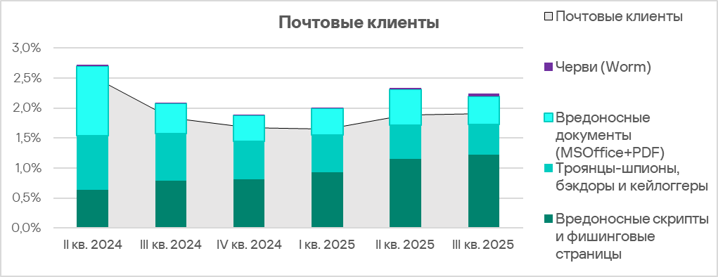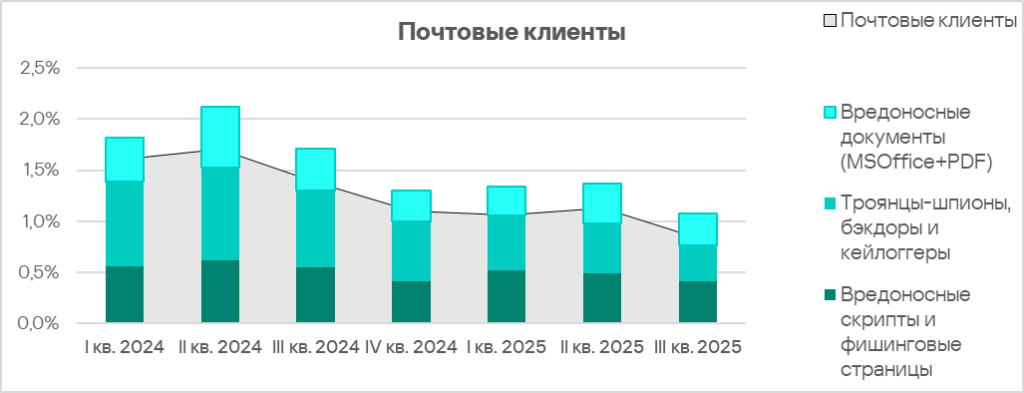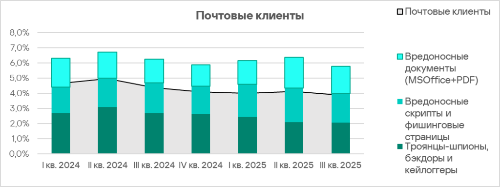 Основные категории угроз из почтовых клиентов, которые блокируются на компьютерах АСУ: шпионское ПО, вредоносные скрипты и фишинговые страницы, вредоносные документы.