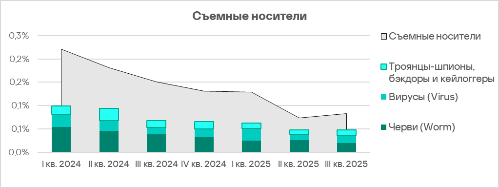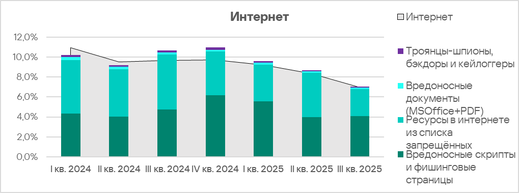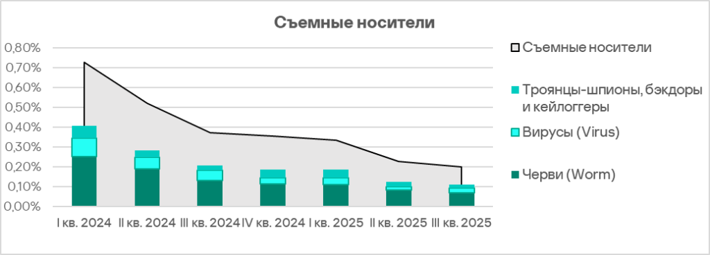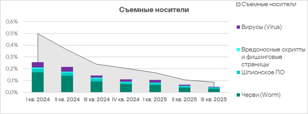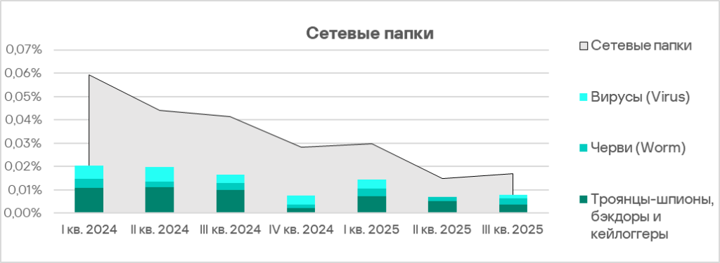 Вредоносные объекты в регионе распространяются преимущественно через интернет и почту. Сетевые папки — минорный источник угроз, но в третьем квартале 2025 года среди всех источников угроз доля компьютеров АСУ, на которых были заблокированы вредоносные объекты, немного увеличилась только у сетевых папок.