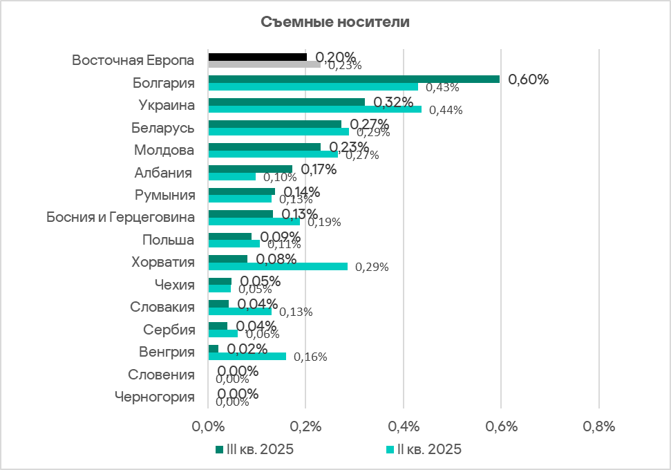 Среди стран региона по доле компьютеров АСУ, на которых были заблокированы угрозы при подключении съемных носителей, с отрывом лидирует Болгария с 0,60%.
