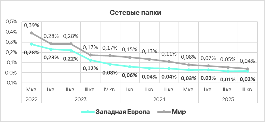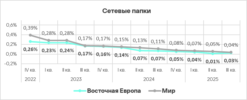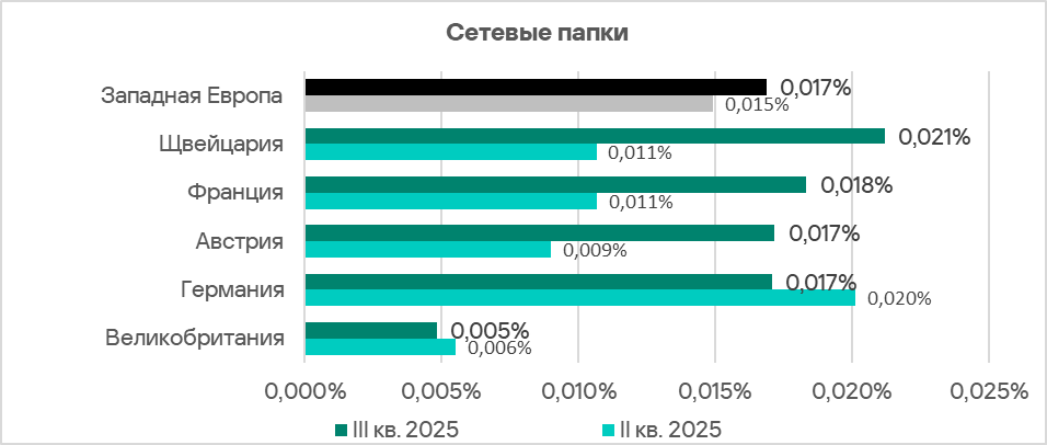 В третьем квартале 2025 года по росту доли компьтеров АСУ, на которых блокируются угрозы в сетевых папках, Восточная Европа лидирует среди европейских регионов. Несмотря на заметный рост показателя этого источника угроз, в защищенной инфраструктуре угрозы в сетевых папках встречаются довольно редко и не во всех странах региона. То же касается и отраслей — угрозы в сетевых папках были обнаружены только в двух отраслях: автоматизация зданий, инжиниринг и интеграция АСУ.