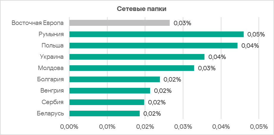 В рейтинге регионов по доле компьютеров АСУ, на которых угрозы блокируются в сетевых папках, Восточная Европа поднялась с 13-го на пятое место. За квартал показатель сетевых папок в регионе вырос в 2,6 раза до 0,026%. Это в 4,3 раза больше, чем в Северной Европе, которая замыкает соответствующий рейтинг.