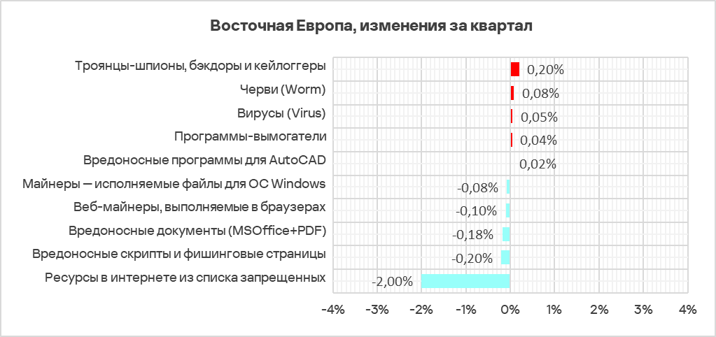 Восточная Европа занимает пятое место в рейтинге регионов по доле компьютеров АСУ, на которых блокируются вредоносные документы. Показатель в регионе (2,58%) — в 4,9 раза больше, чем в Северной Европе, которая замыкает соответствующий рейтинг.