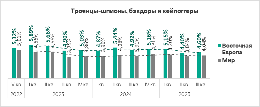 Доля компьютеров АСУ, на которых блокируются шпионские программы, в Восточной Европе колеблется. В третьем квартале 2025 года показатель немного увеличился после минимума прошлого квартала.