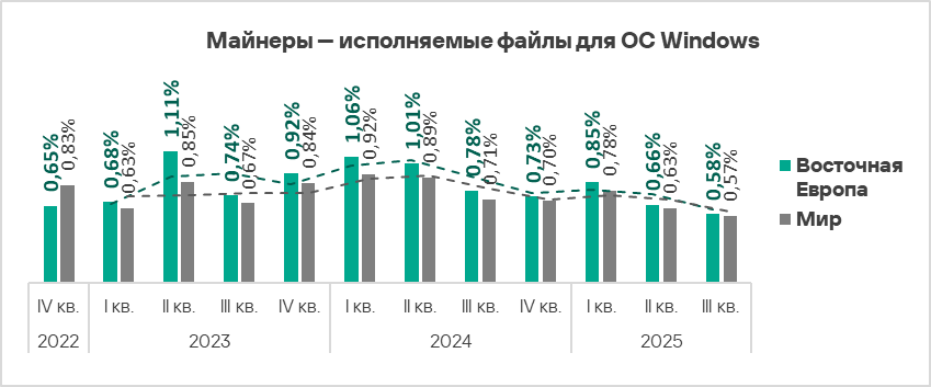По показателю майнеров в формате исполняемых файлов Восточная Европа занимает третье место среди регионов.