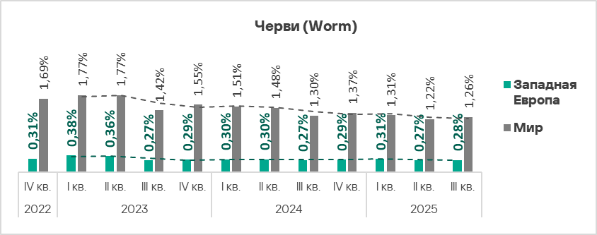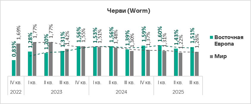 С конца 2023 года показатель червей в регионе колеблется в диапазоне 1,4–1,6%. В третьем квартале 2025 года доля компьютеров АСУ, на которых блокируются черви, в регионе увеличилась.