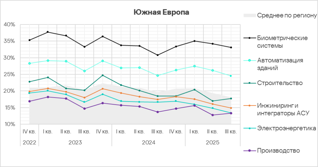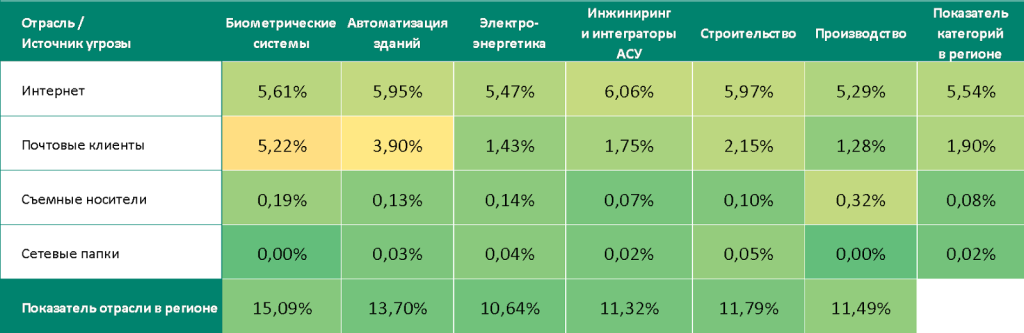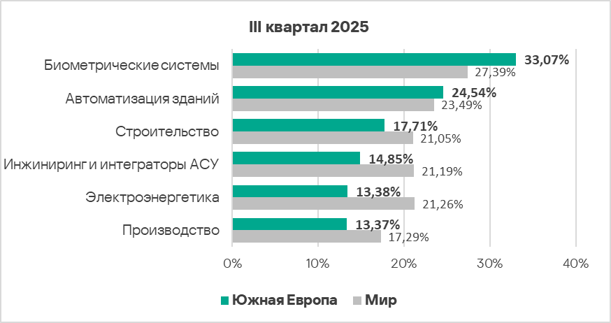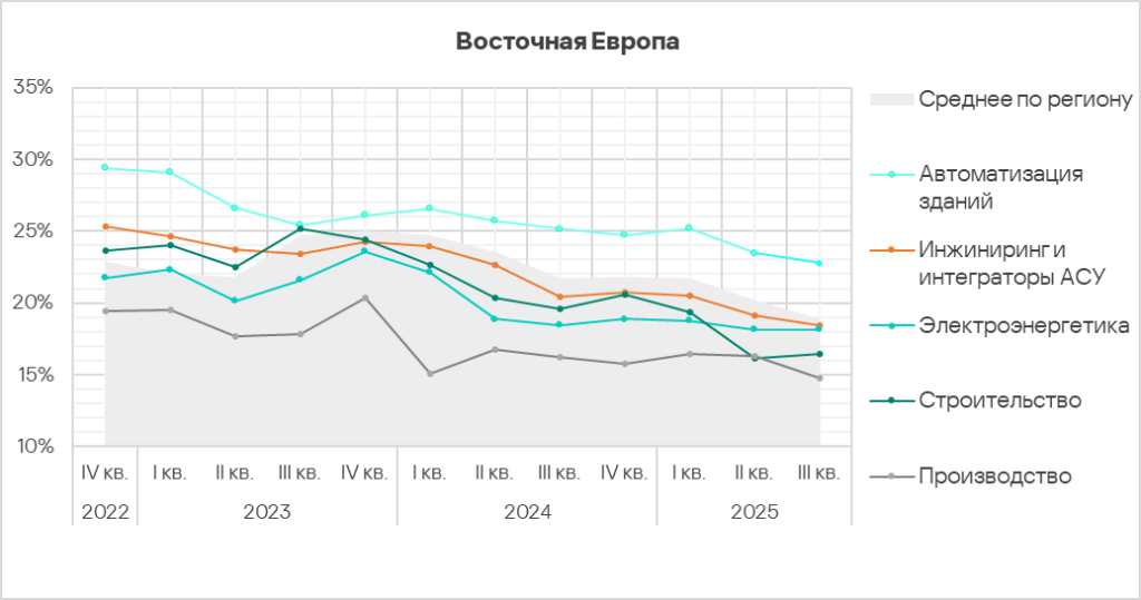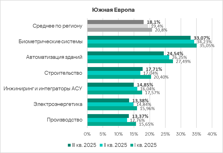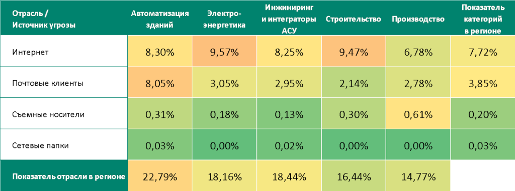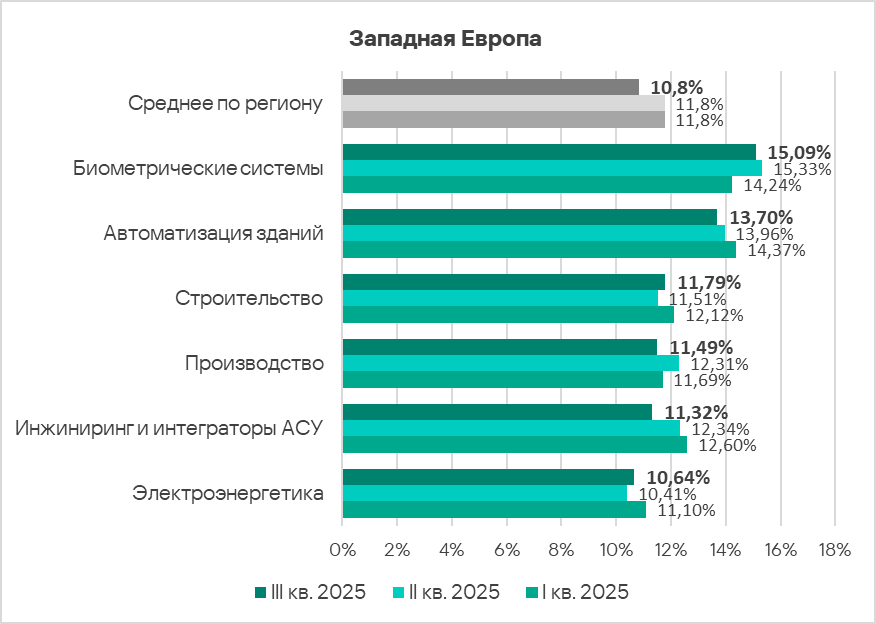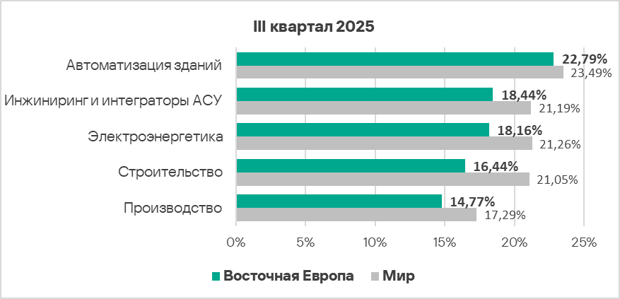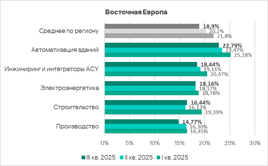 Среди отраслей непосредственно в Восточной Европе отрасль автоматизация зданий лидирует по показателям этих трех категорий угроз.