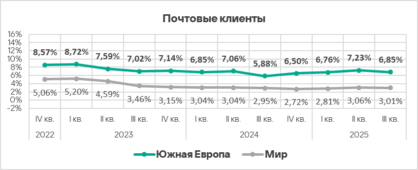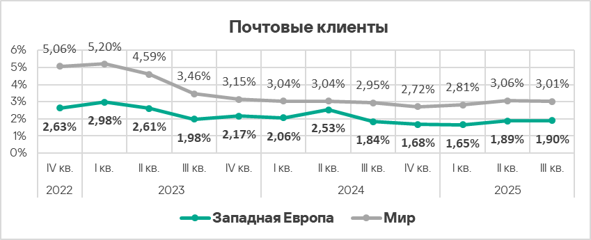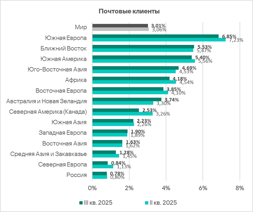 По доле компьютеров АСУ, на которых были заблокированы угрозы в почтовых клиентах, в третьем квартале 2025 года Восточная Европа занимает шестое место среди регионов с показателем 3,85%. Это в 4,9 раза больше, чем в России, которая замыкает соответствующий рейтинг.
