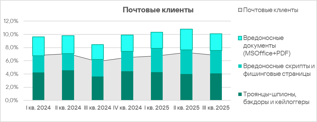 Высокие показатели угроз, распространяющихся через почтовые клиенты (фишинг), и шпионского ПО — признак высокой доступности технологических систем в регионе для продвинутых категорий злоумышленников.