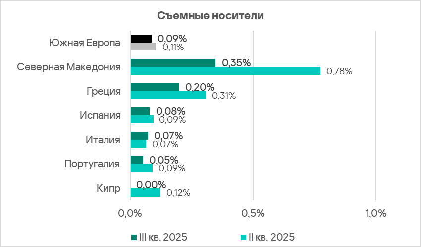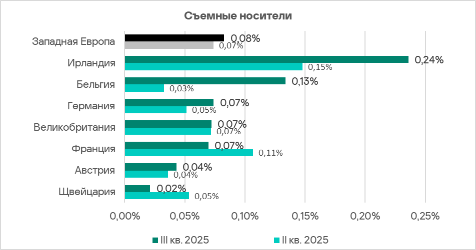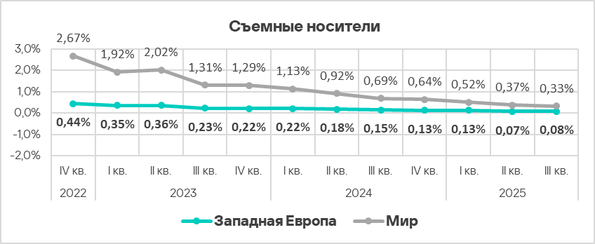 По доле компьютеров АСУ, на которых угрозы блокируются при подключении съемных носителей, в третьем квартале 2025 года Восточная Европа занимает среди регионов седьмое место с 0,20%. Это в 4,0 раза превышает показатель в регионе Австралия и Новая Зеландия, который занимает последнее место в соответствующем рейтинге.