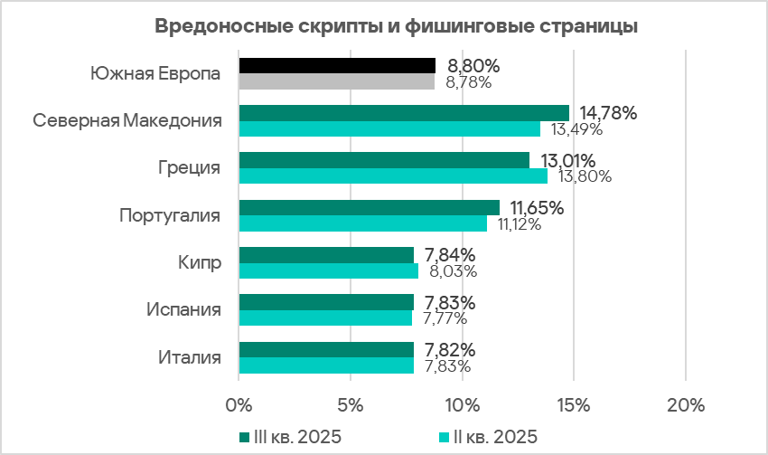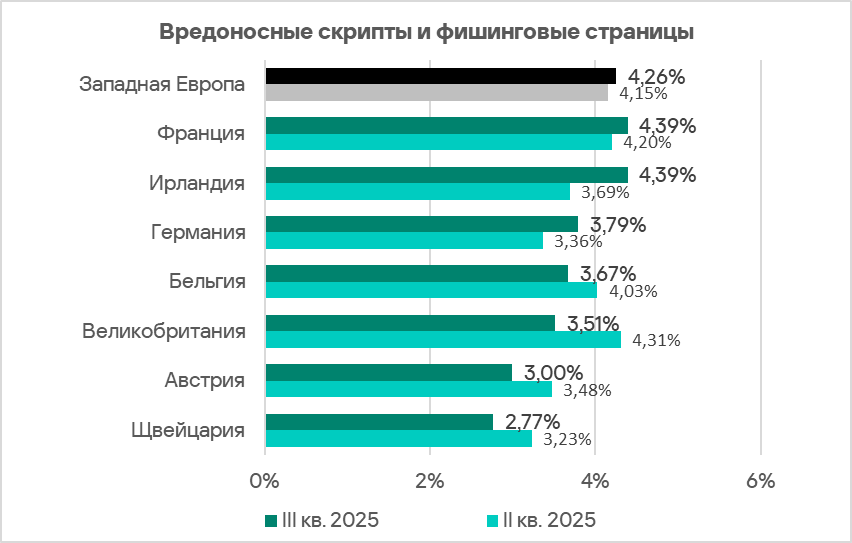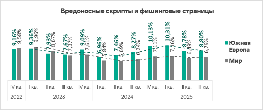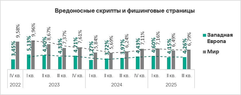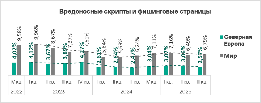 Доля компьютеров АСУ, на которых блокируются вредоносные скрипты и фишинговые страницы, в Восточной Европе в третьем квартале 2025 года сопоставима со среднемировым показателем.