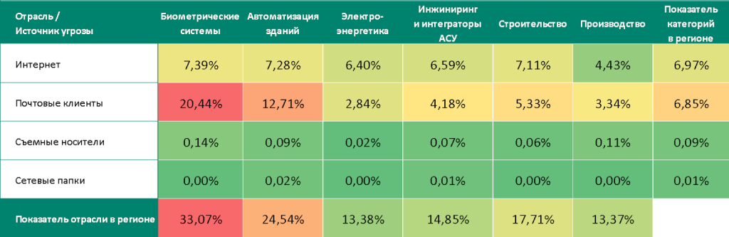 При оценке проблем отраслей в регионах мы используем тепловые карты. Цвет на карте определяет положение показателя в глобальном рейтинге отраслей в регионах (отдельно по каждой категории угроз или каждому источнику). Красный цвет указывает на то, что значение близко к максимальному.