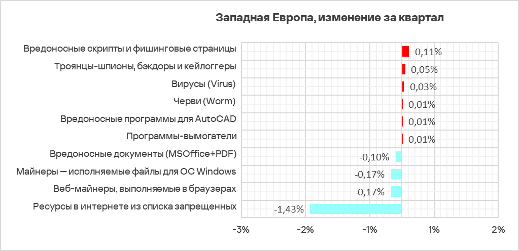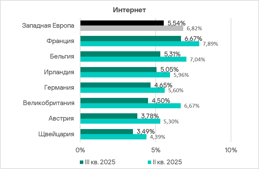 В странах региона доля компьютеров АСУ, на которых были заблокированы угрозы из интернета, варьирует от 2,86% в Люксембурге до 4,84% в Латвии. Показатель за квартал уменьшился во всех странах региона.
