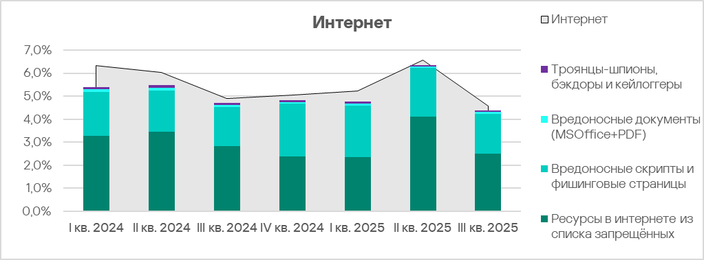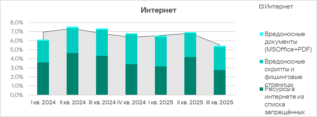 Основные категории угроз из интернета, которые блокируются на компьютерах АСУ в регионе: вредоносные скрипты и фишинговые страницы и ресурсы в интернете из списка запрещенных.