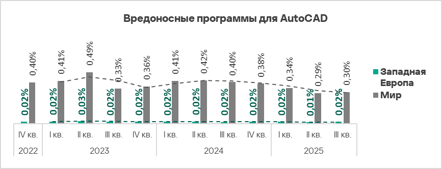 - второе место по показателям следующих категорий угроз: ресурсы в интернете из списка запрещенных и вредоносные программы для AutoCAD;
