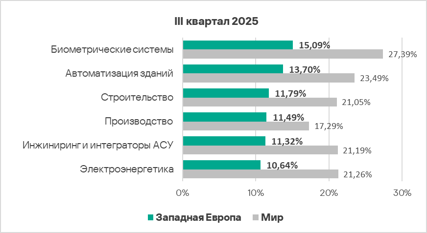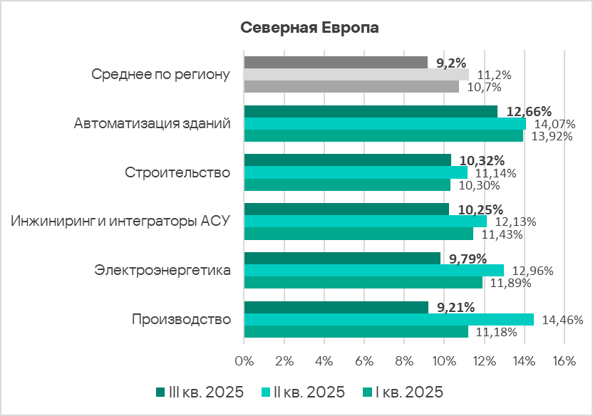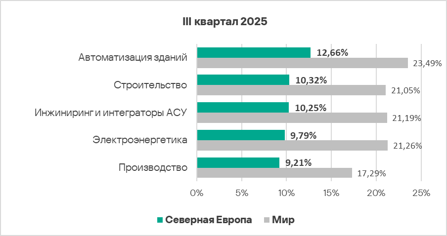 В третьем квартале 2025 года рейтинг исследуемых отраслей и ОT-инфраструктур по доле компьютеров АСУ, на которых блокировались вредоносные объекты, в Северной Европе возглавила отрасль автоматизация зданий.