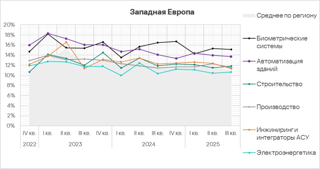 Показатели категорий угроз в отраслях в Восточной Европе, III квартал 2025 года