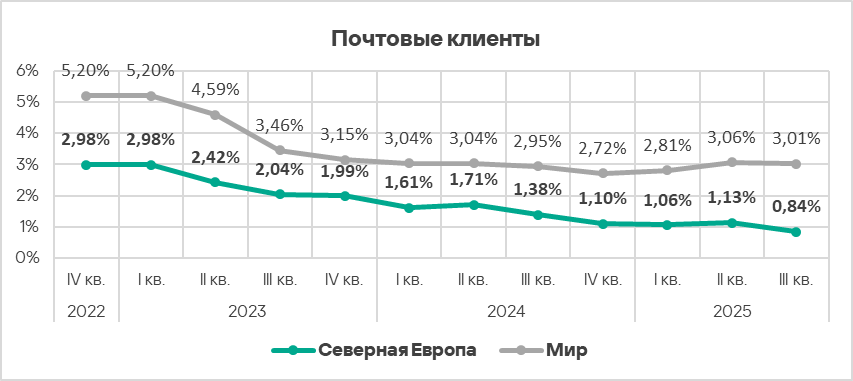 В рейтинге регионов по доле компьютеров АСУ, на которых блокируются угрозы в почтовых клиентах, в третьем квартале 2025 года Северная Европа занимает 13-е место.
