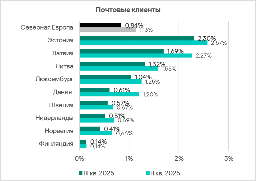 Среди стран региона по доле компьютеров АСУ, на которых были заблокированы угрозы из почтовых клиентов, лидирует Эстония с 2,30%. Наименьший показатель – в Финляндии (0,14%). Во всех странах, кроме Финляндии, показатель за квартал уменьшился.
