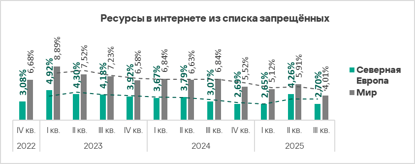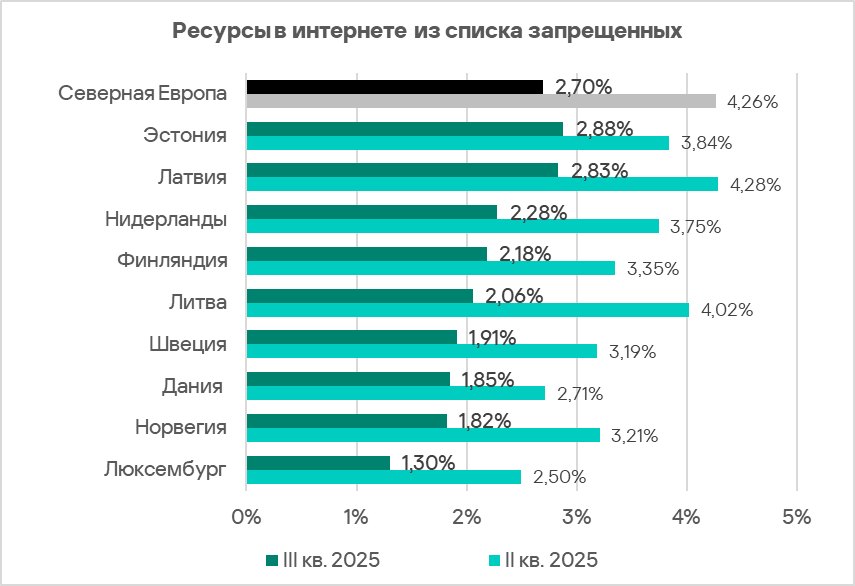 В третьем квартале 2025 года в Северной Европе, как и во всех регионах, доля компьютеров АСУ, на которых блокировались ресурсы в интернете из списка запрещенных, уменьшилась.