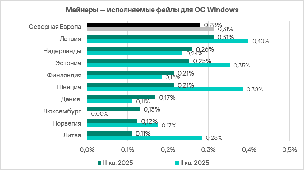 Среди стран региона в рейтинге по доле компьютеров АСУ, на которых блокируются майнеры — исполняемые файлы для ОС Windows, лидирует Латвия с 0,31%. За квартал показатель вырос в Нидерландах, Финляндии, Дании и Люксембурге.
