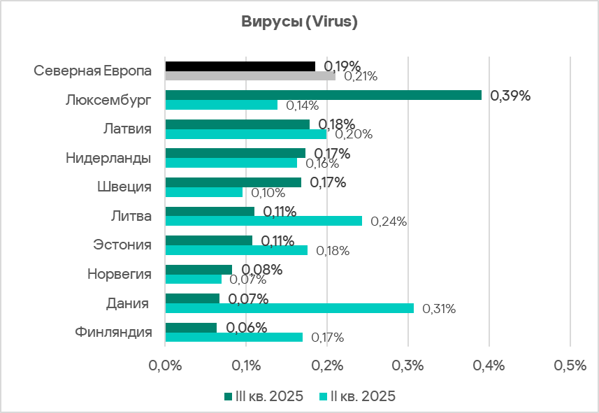 Среди стран региона по доле компьютеров АСУ, на которых были заблокированы вирусы, с большим отрывом лидирует Люксембург, где показатель за квартал вырос в 2,8 раза — до 0,39%. На втором месте находится Латвия с 0,18%. Кроме Люксембурга, показатель вырос в Швеции, Нидерландах и Норвегии.