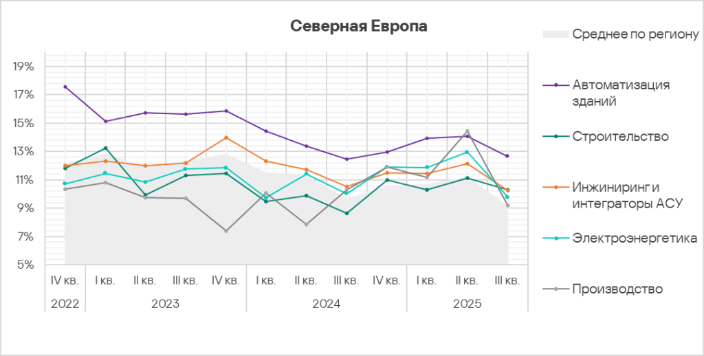 Показатели категорий угроз в отраслях в Северной Европе, III квартал 2025 года