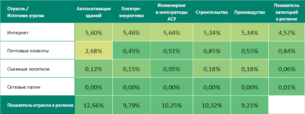 Угроза целевых атак в регионе особенно актуальна для отрасли автоматизация зданий. По показателям вредоносных документов и шпионских программ в этой отрасли Восточная Европа занимает третье место среди регионов, по показателю категории вредоносные скрипты и фишинговые страницы — четвертое.