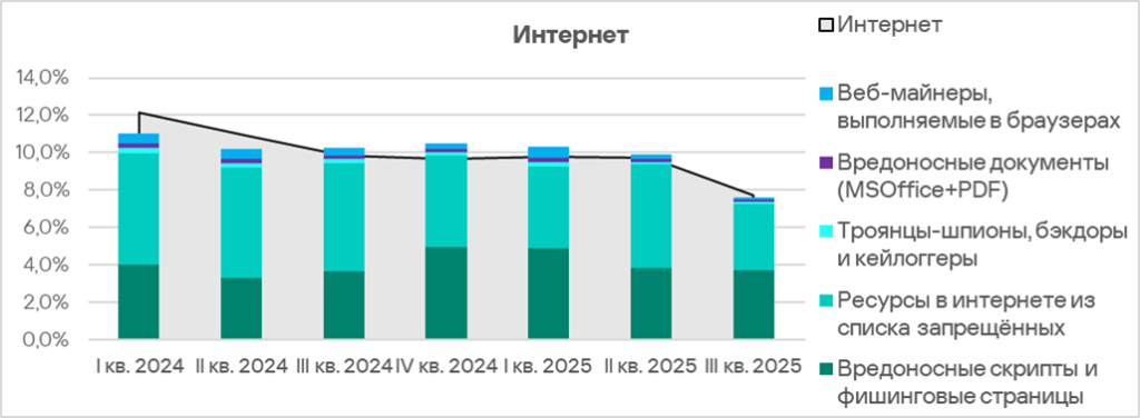 Доля компьютеров АСУ, на которых блокируются вредоносные скрипты и фишинговые страницы, в регионе колеблется. В третьем квартале 2025 года показатель оказался наименьшим за три года.