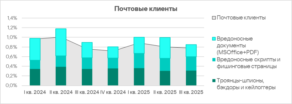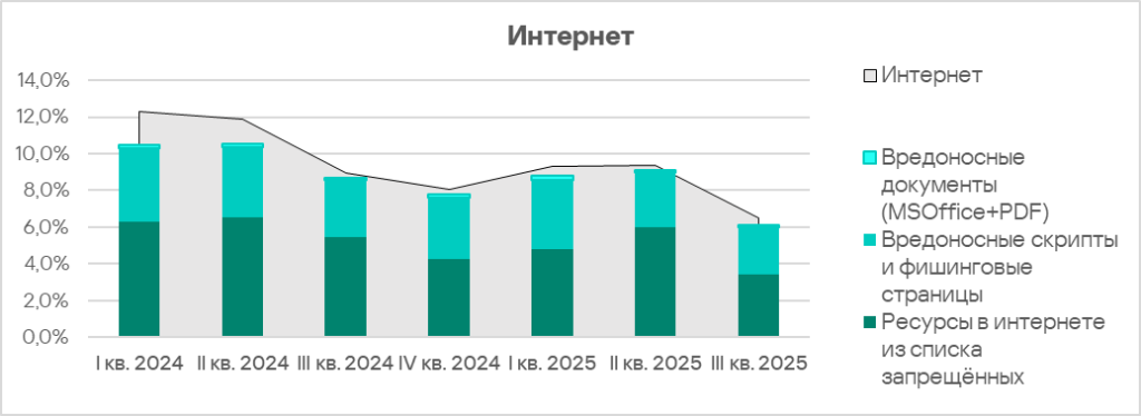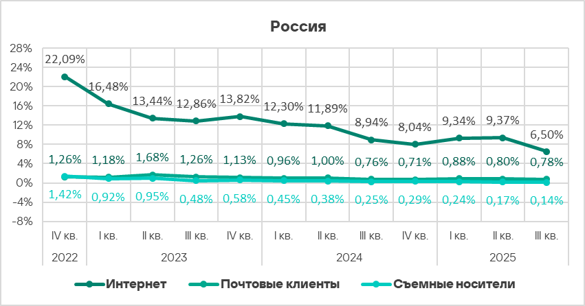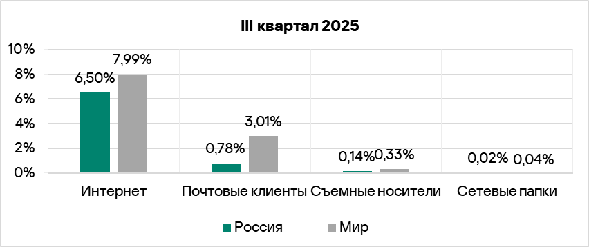 Для вредоносных документов и шпионских программ электронная почта — основной канал распространения. Вредоносные скрипты распространяются как в почте, так и в интернете. В третьем квартале 2025 года интернет был основным источником этой угрозы.