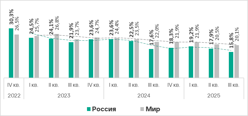 Показатель в регионе уменьшается второй квартал подряд. В третьем квартале 2025 года он оказался наименьшим за три года — 15,8%. Это в 1,7 раза больше, чем в Северной Европе, которая замыкает соответствующий рейтинг регионов.