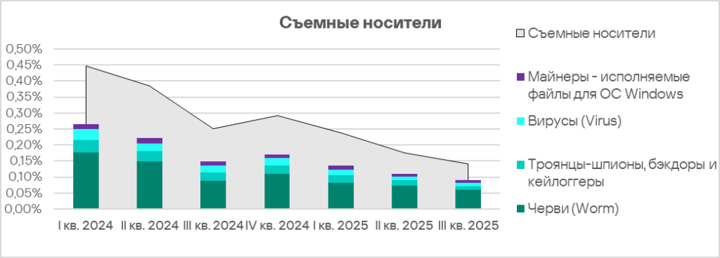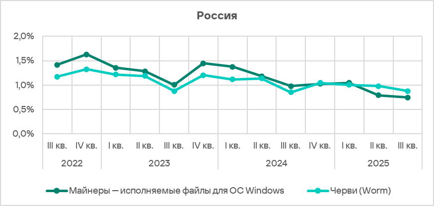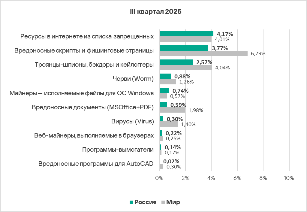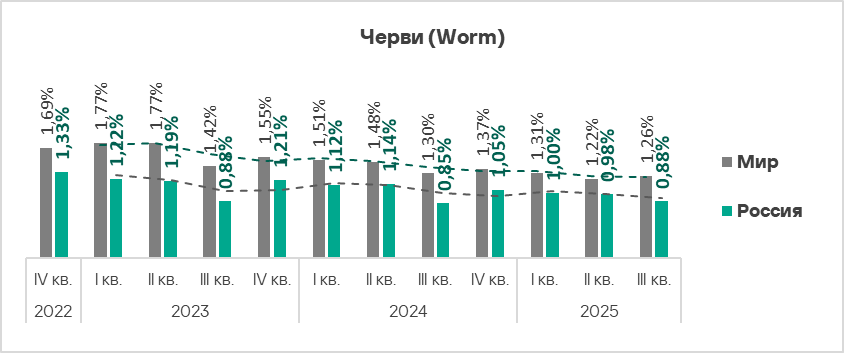 Черви в третьем квартале 2025 года в рейтинге категорий угроз в регионе заняли четвертое место. На такой высокой позиции в региональном рейтинге эта категория угроз, кроме России, находится только в Средней Азии и Закавказье. В рейтинге регионов по этому показателю Россия на восьмом месте.