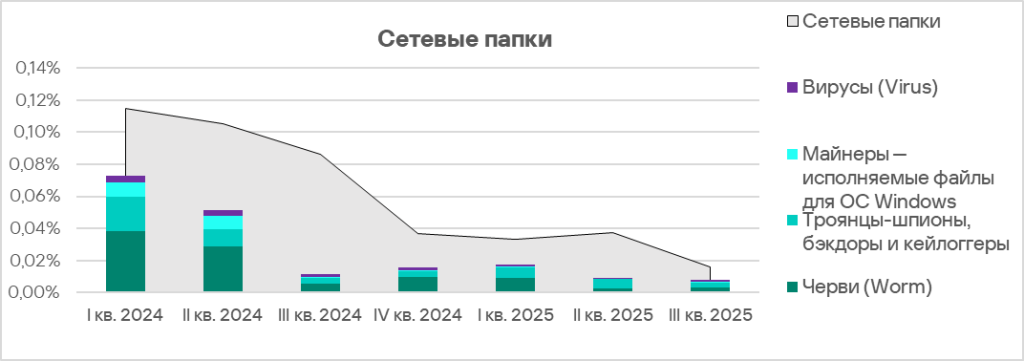 Основные категории угроз, которые блокировались в сетевых папках в третьем квартале 2025 года: черви, шпионские программы, вирусы и майнеры – исполняемые файлы для ОС Windows.