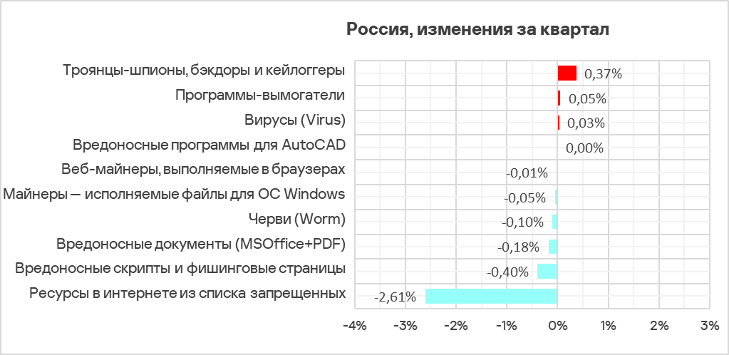 За квартал показатель увеличился у трех категорий угроз: шпионские программы, программы-вымогатели и вирусы.