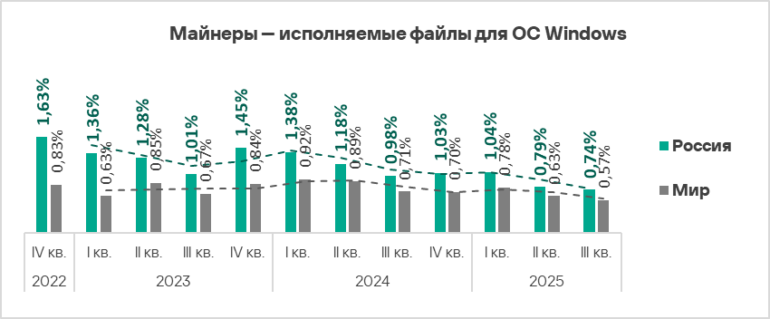 Показатель майнеров в формате исполняемых файлов для ОС Windows в России, как и во всех регионах, в третьем квартале 2025 года уменьшился. Значение в России оказалось минимальным за три года — 0,74%. Это в 5,7 раза больше, чем в регионе Австралия и Новая Зеландия, который замыкает соответствующий рейтинг.