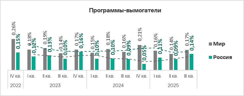 В третьем квартале 2025 года программы-вымогатели распространялись в России через интернет и почту. Но в почтовых клиентах эти угрозы блокировались вдвое чаще, чем из интернета.