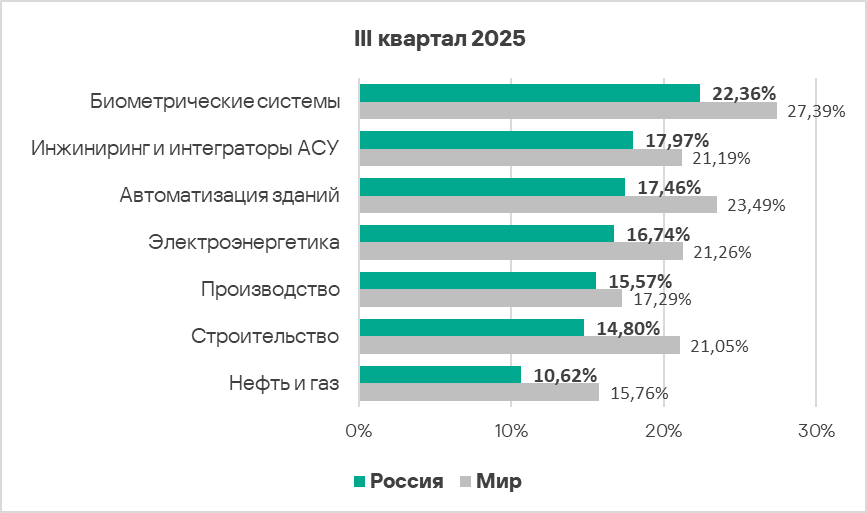 В России из всех рассмотренных в отчете отраслей и ОТ-инфраструктур чаще всего вредоносные объекты блокируются в биометрических системах.