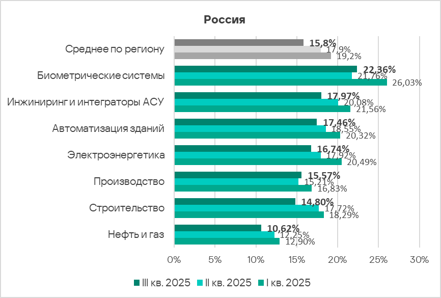 В отраслях автоматизация зданий, нефть и газ и в отрасли строительство высокие показатели программ-вымогателей. По этому показателю в отрасли автоматизация зданий Россия лидирует, в нефтегазовой отрасли и строительство — занимает второе место в соответствующих рейтингах регионов.