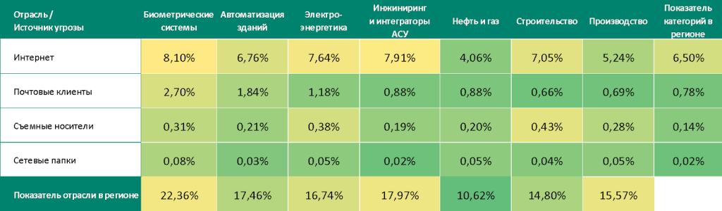 При оценке проблем отраслей в регионах мы используем тепловые карты. Цвет на карте определяет положение показателя в глобальном рейтинге отраслей в регионах (отдельно по каждой категории угроз или каждому источнику). Красный цвет указывает на то, что значение близко к максимальному.