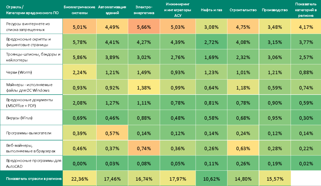 Угроза актуальна для отраслей автоматизация зданий, нефть и газ и строительство. По показателю программ-вымогателей в автоматизации зданий Россия лидирует, в нефтегазовой отрасли и строительстве занимает второе место в соответствующих рейтингах регионов.