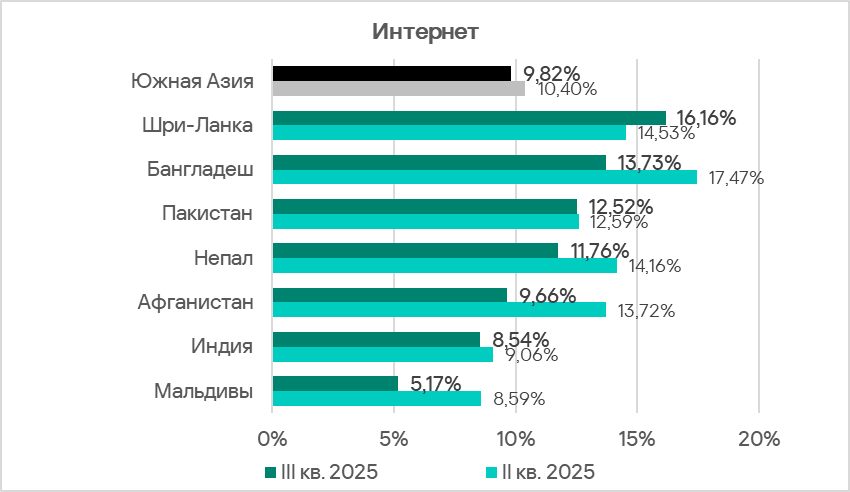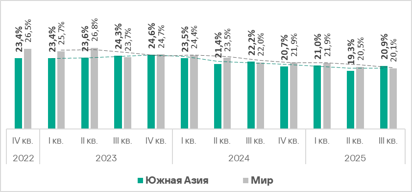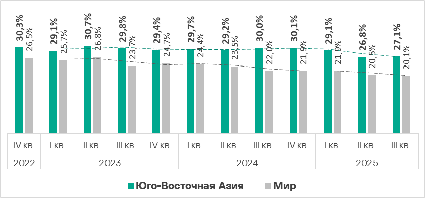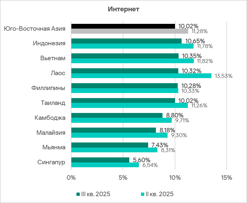 Среди стран региона по этому показателю с отрывом от остальных лидируют Лаос с 1,60% (в этой стране показатель за квартал вырос в 2,1 раза), и Мьянма с 1,33%. Наименьшее значение в Сингапуре — 0,12%.