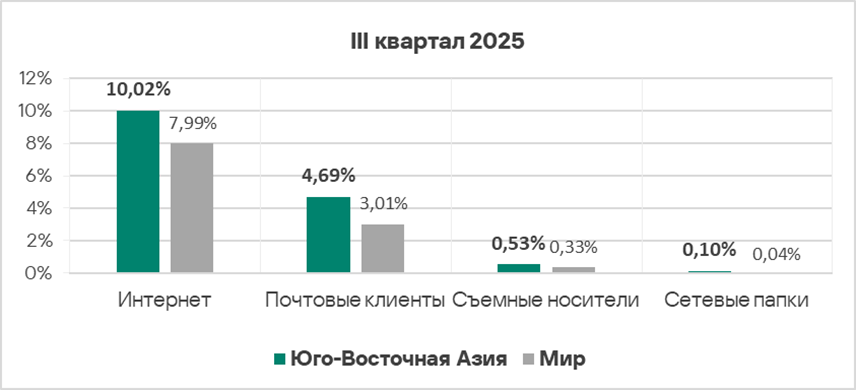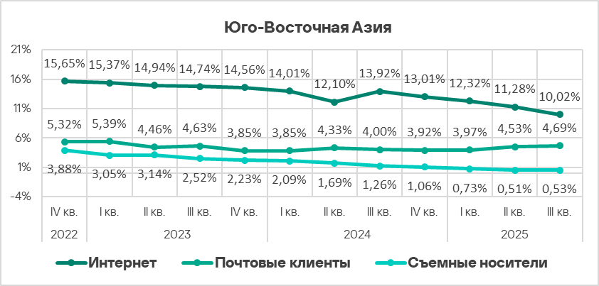 Показатели источников угроз в отраслях в Юго-Восточной Азии, III квартал 2025 года