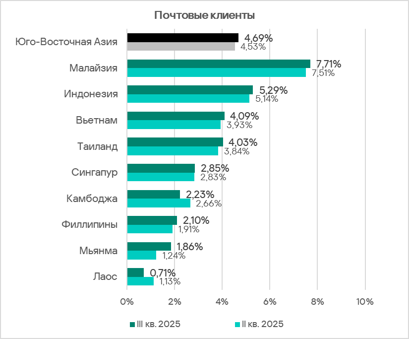 Среди стран региона по этому показателю с заметным отрывом лидирует Малайзия с 7,71%. Минимальная доля компьютеров АСУ, на которых угрозы были заблокированы в почтовых клиентах, — в Лаосе (0,71%). В отличие от большинства стран региона (все, кроме Камбоджи), в Лаосе показатель за квартал уменьшился.