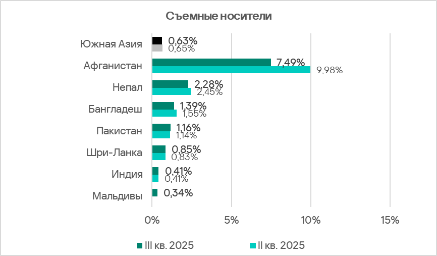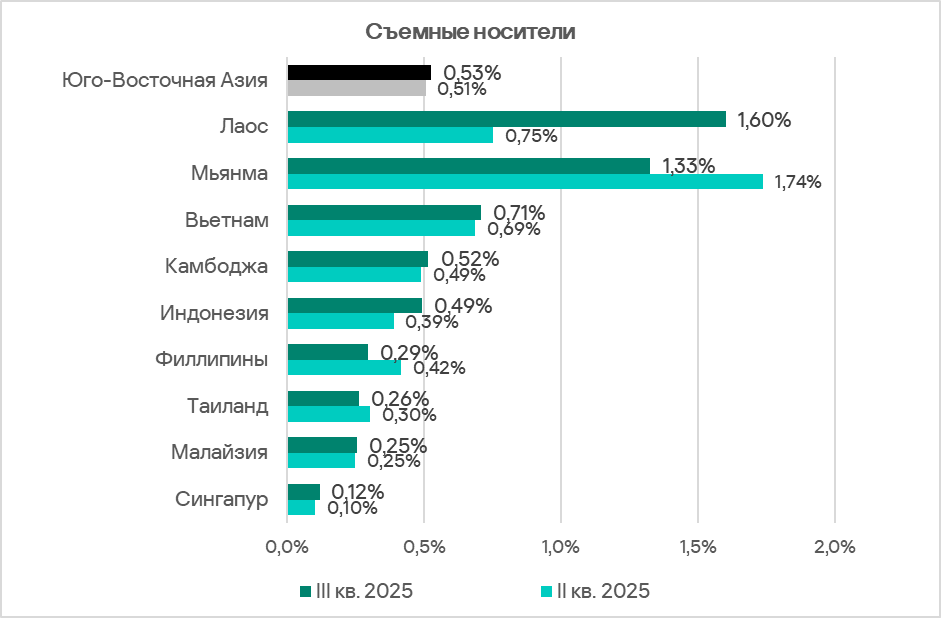Юго-Восточная Азия занимает пятое место в рейтинге регионов по доле компьютеров АСУ, на которых угрозы блокируются при подключении съемных носителей. Первые шесть позиций в этом рейтинге занимают Африка (лидирует с большим отрывом), регионы Азии и Ближний Восток. Показатели не только Африки, но и всех этих регионов, заметно больше значений в остальных регионах.