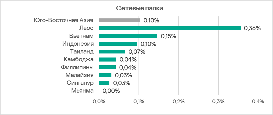 Юго-Восточная Азия занимает второе место среди регионов по доле компьютеров АСУ, на которых угрозы были заблокированы в сетевых папках, с 0,10%. Это значение выше среднемирового в 2,5 раза.