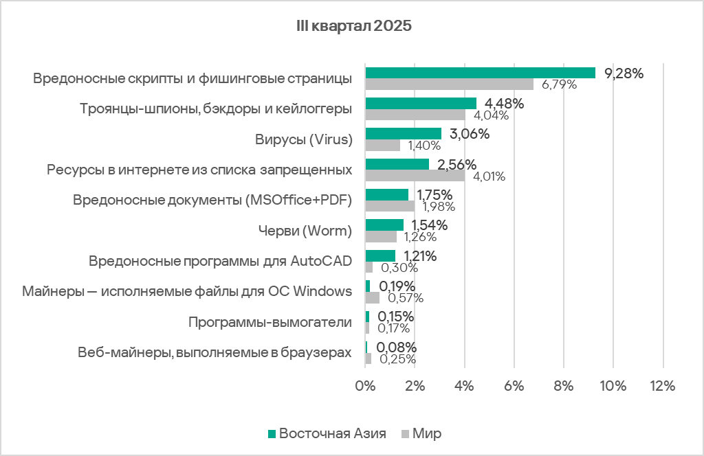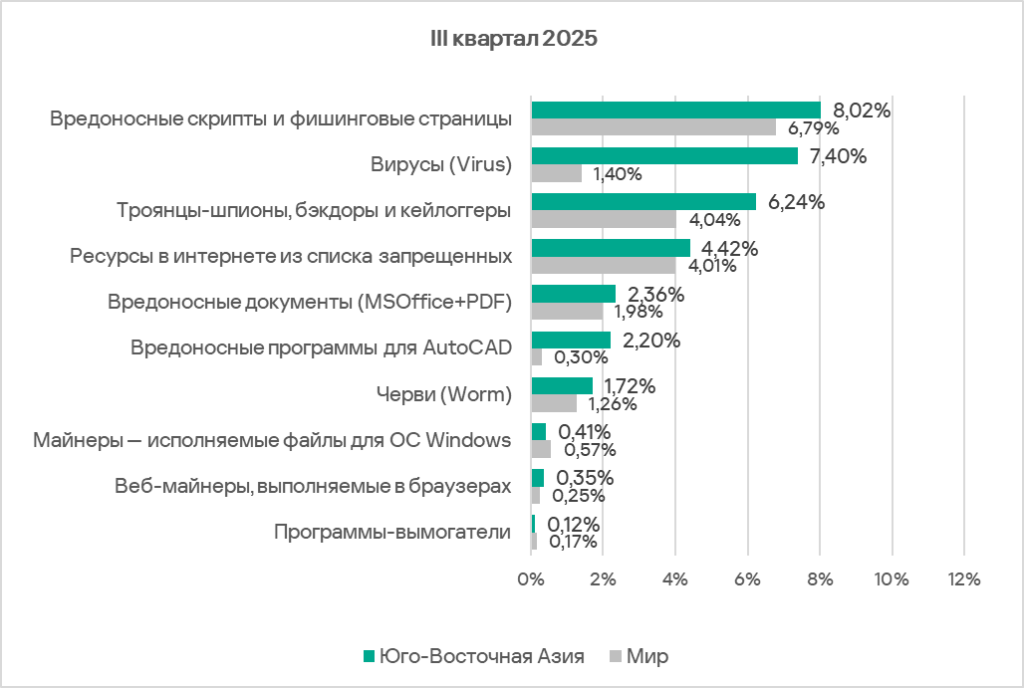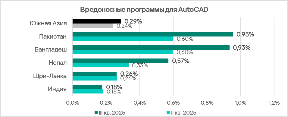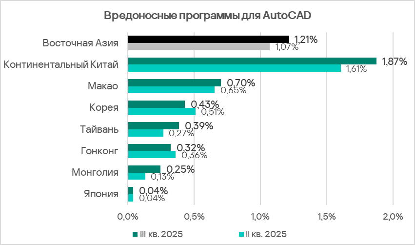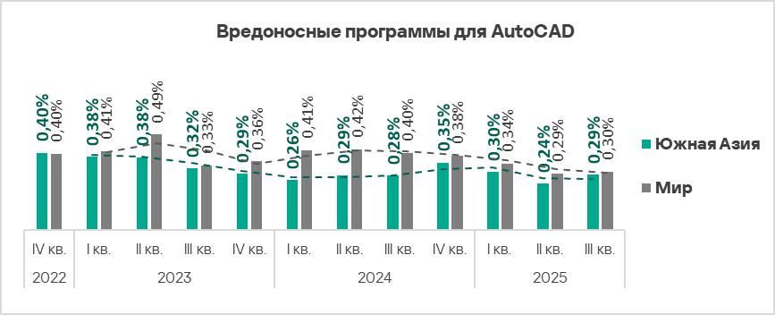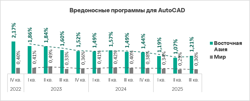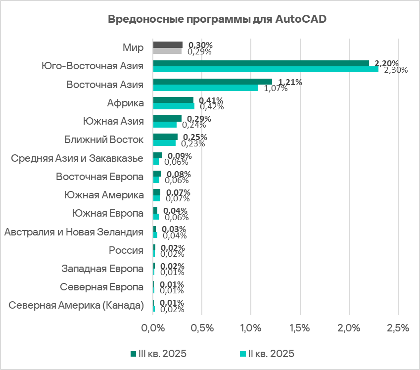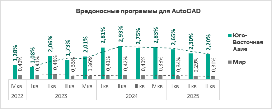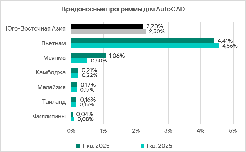 Среди всех категорий угроз, в мировом рейтинге в третьем квартале 2025 года по доле компьютеров АСУ, на которых была заблокирована угроза, программы для AutoCAD находятся на седьмом месте из 10. Во всех регионах, кроме Южной, Восточной и Юго-Восточной Азии, эта категория занимает последнее место. А в региональном рейтинге Юго-Восточной Азии – шестое, с показателем, который в 7,3 раза превышает среднемировой и является самым высоким в мире.