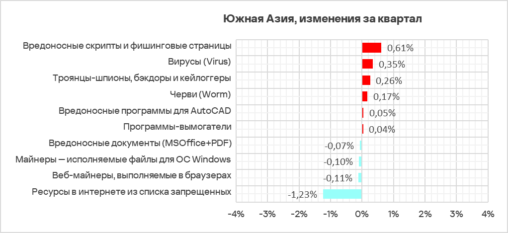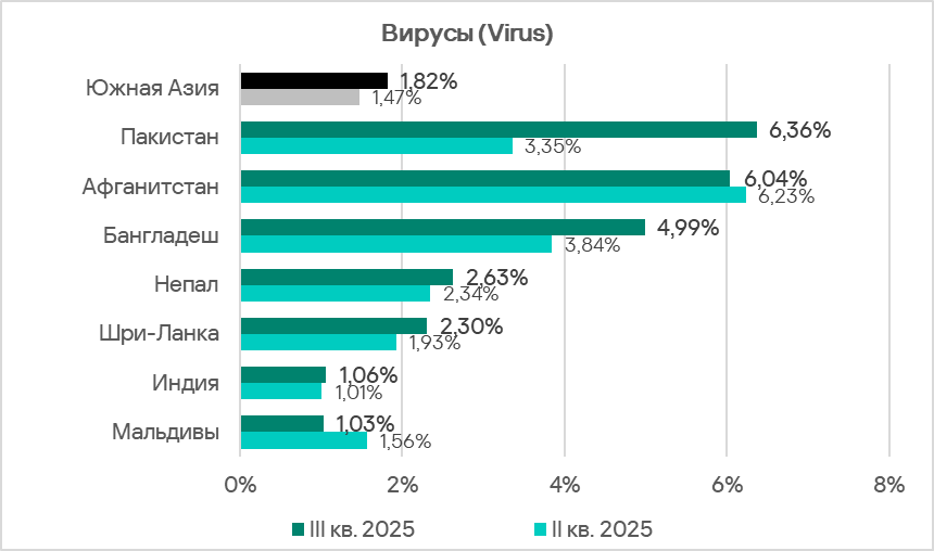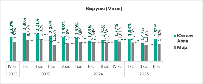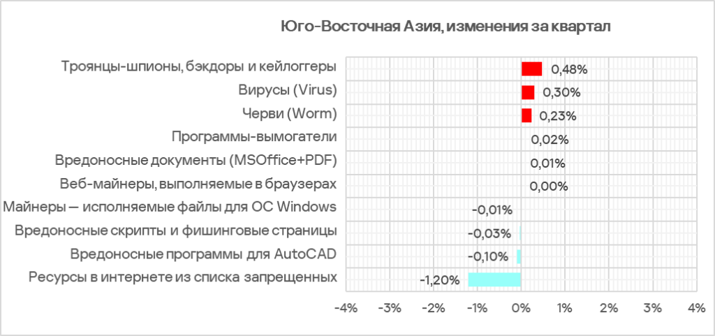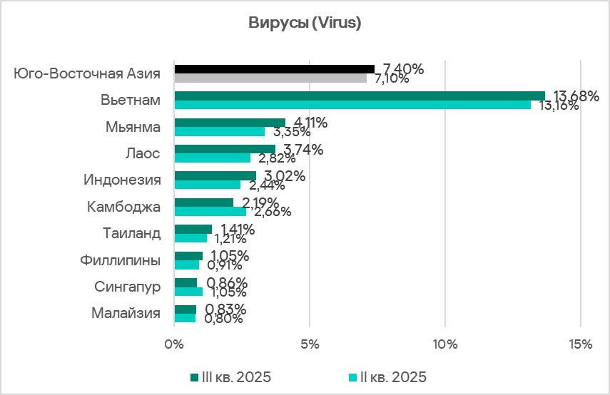 В Юго-Восточной Азии вирусы занимают второе место в региональном рейтинге категорий вредоносных программ по доле компьютеров АСУ, на которых они были заблокированы. Это самая высокая позиция вирусов в региональных рейтингах. Региональный показатель в 5,3 раза превышает среднемировой и является самым высоким значением в мире.